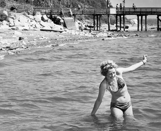 Miss White Rock 1976, Maureen Leninan, wades into the ocean beside pier at resort.