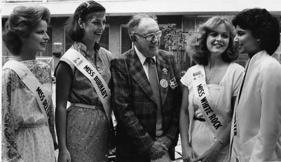 1980 - PNE president Erwin Swanguard chats with beauty queens during the annual Miss PNE garden party at the Sheraton Villa in Burnaby. From left to right: Miss Delta, Lisa Robers; Miss Burnaby, Lynda Stewart; Swanguard; Miss White Rock, Theresa Taylor; and Miss New Westminster, Donna Rama.