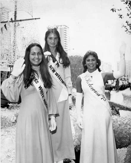 1975 - "Beauty on parade was a highlight of the Pacific National Exhibition opening day parade Saturday when these Miss P.N.E. contestants were applauded by an estimated 150,000 people who lined the six mile parade route in the rain. They are Miss White Rock, Holly Reynolds, Miss New Westminster, Karen Hodson and Miss Kelowna, Karen Wienberg. Miss P.N.E. will be selected Tuesday from 39 contestants representing cities and towns throughout B.C. The P.N.E. runs through Labour Day, September 1."